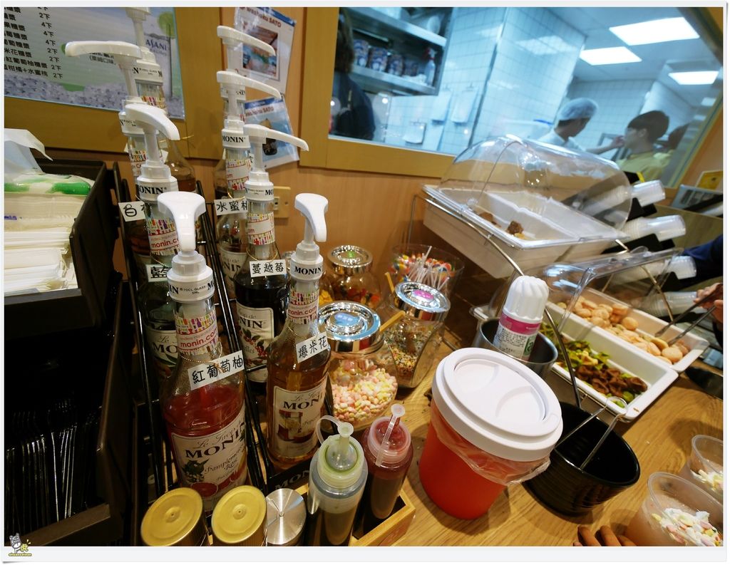 甜點自助區有氣水、紅茶、冰沙、咖啡~還有一罐罐有壓嘴頭的,似乎是各種口味的糖漿來的。