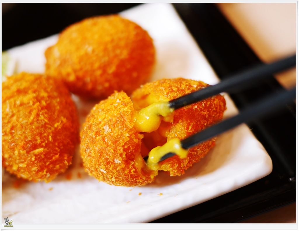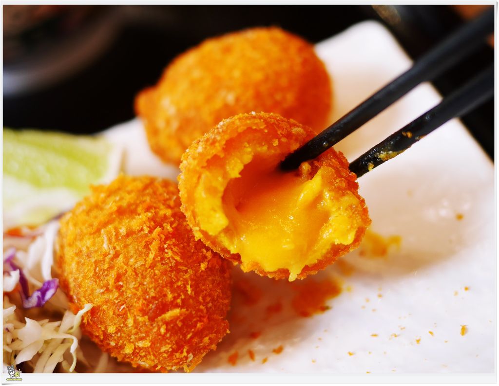 爆漿南瓜酥一份有3顆~旁邊還附上淋了胡麻醬的生菜,好吃捏!南瓜酥則是