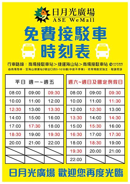 捷運/免費接駁車 ▶ 捷運板南線(藍線)至『海山站 3號出口』轉搭日月光廣場免費接駁車